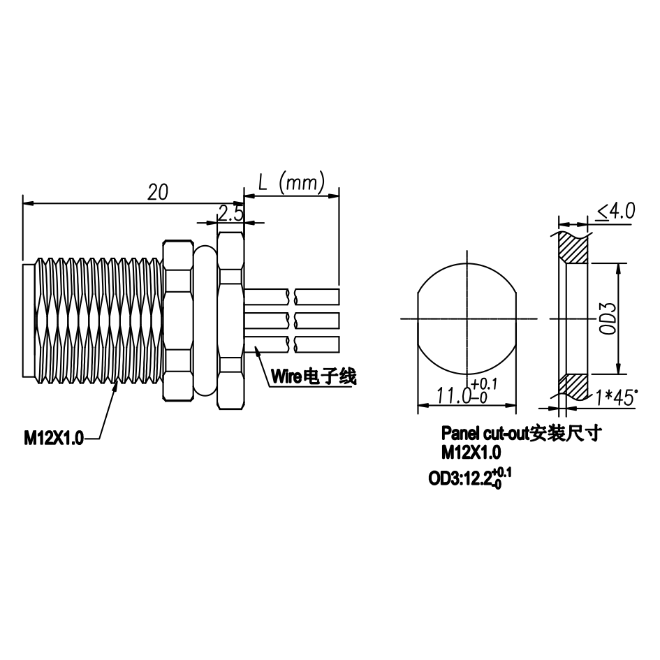 M12 Male Panel Mount, Solder Type, Front Fastened, With Wires