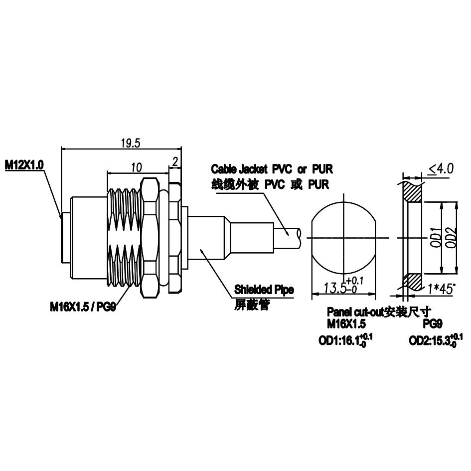 M12 Female Panel Mount, Solder Type, Front Fastened, With Cable Shielded