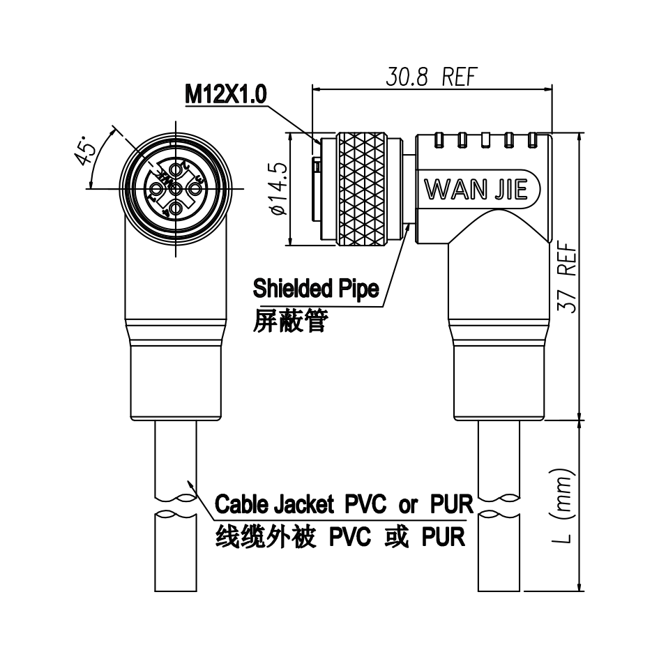 M12 Female Molded Cables, Angled, Shielded