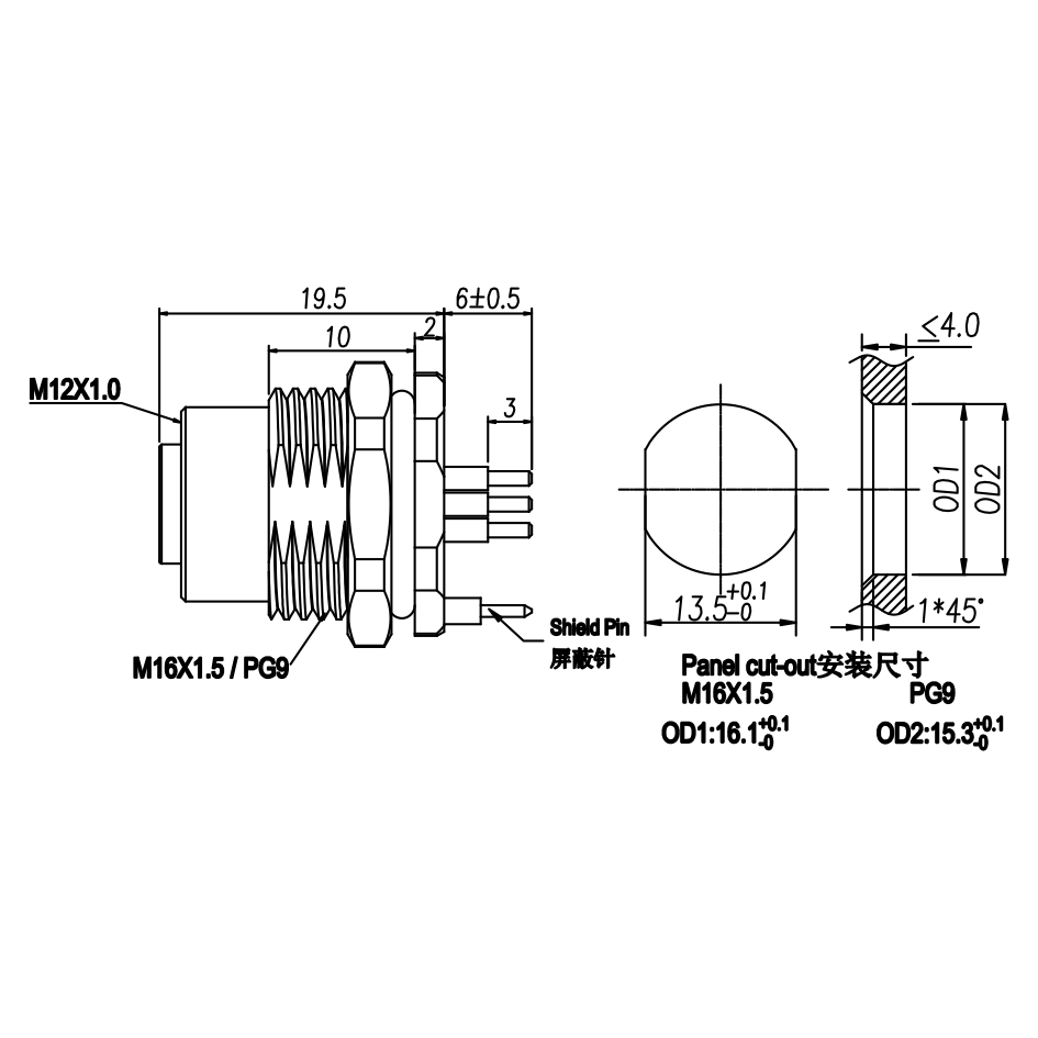 M12 母头面板式,PCB型,前锁安装,屏蔽针