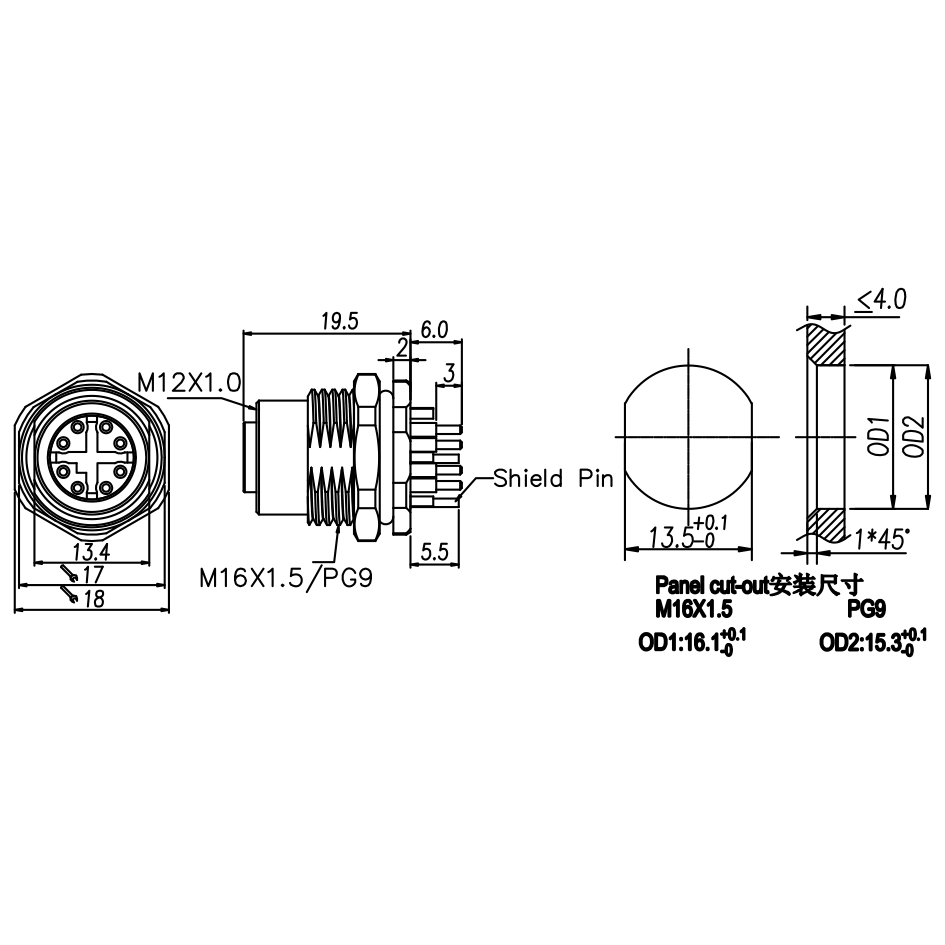 M12 母头面板式,PCB型,前锁安装,屏蔽针