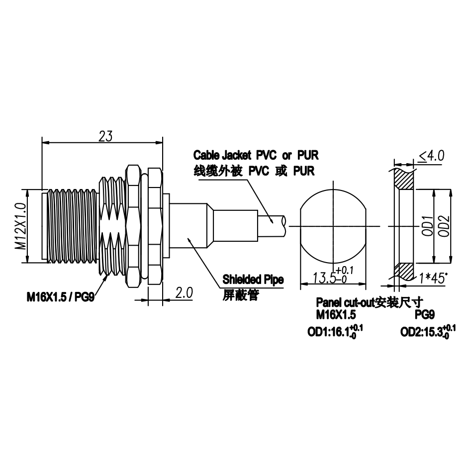 M12 公头面板式,焊接式,前锁安装,屏蔽线缆